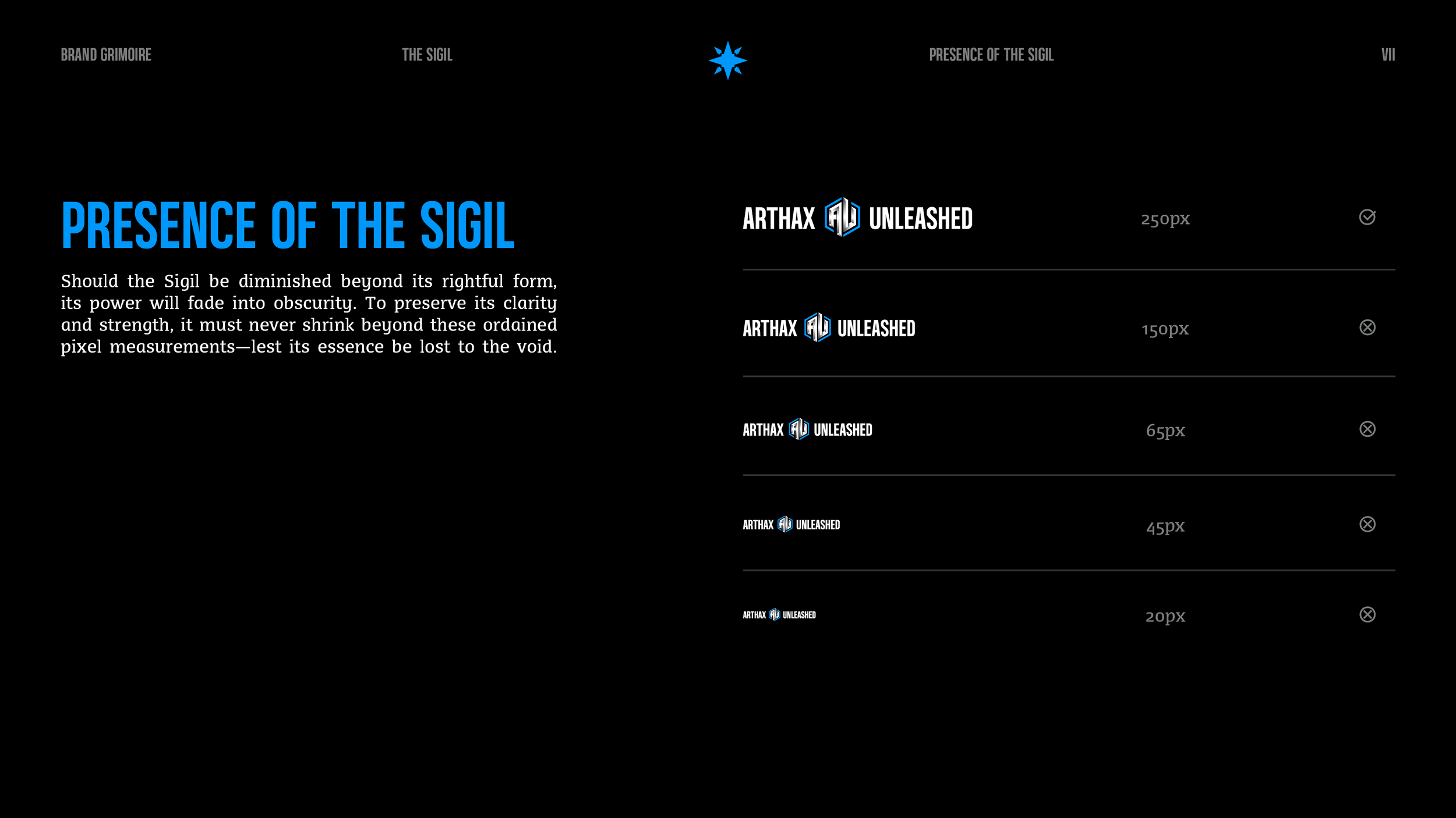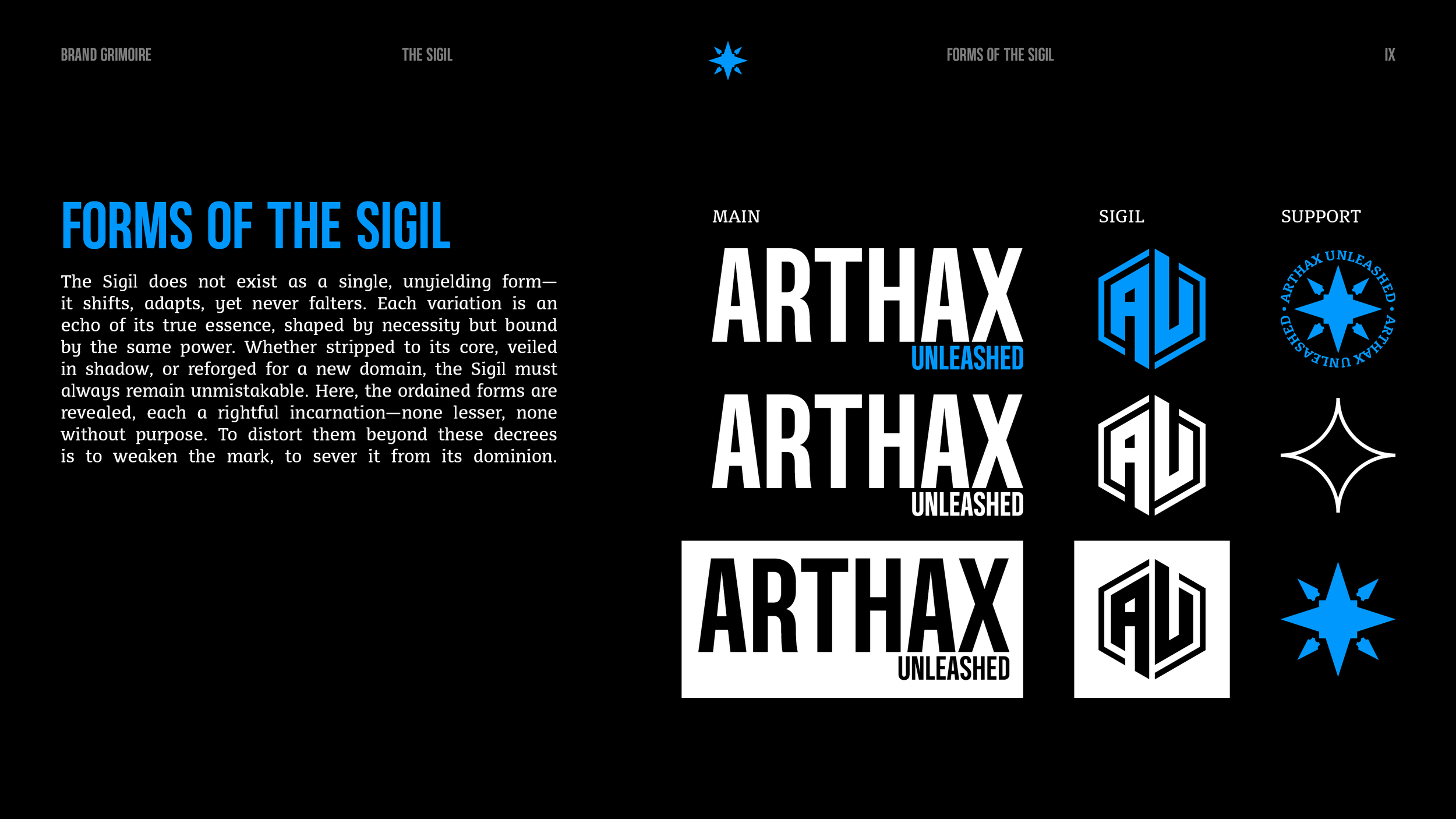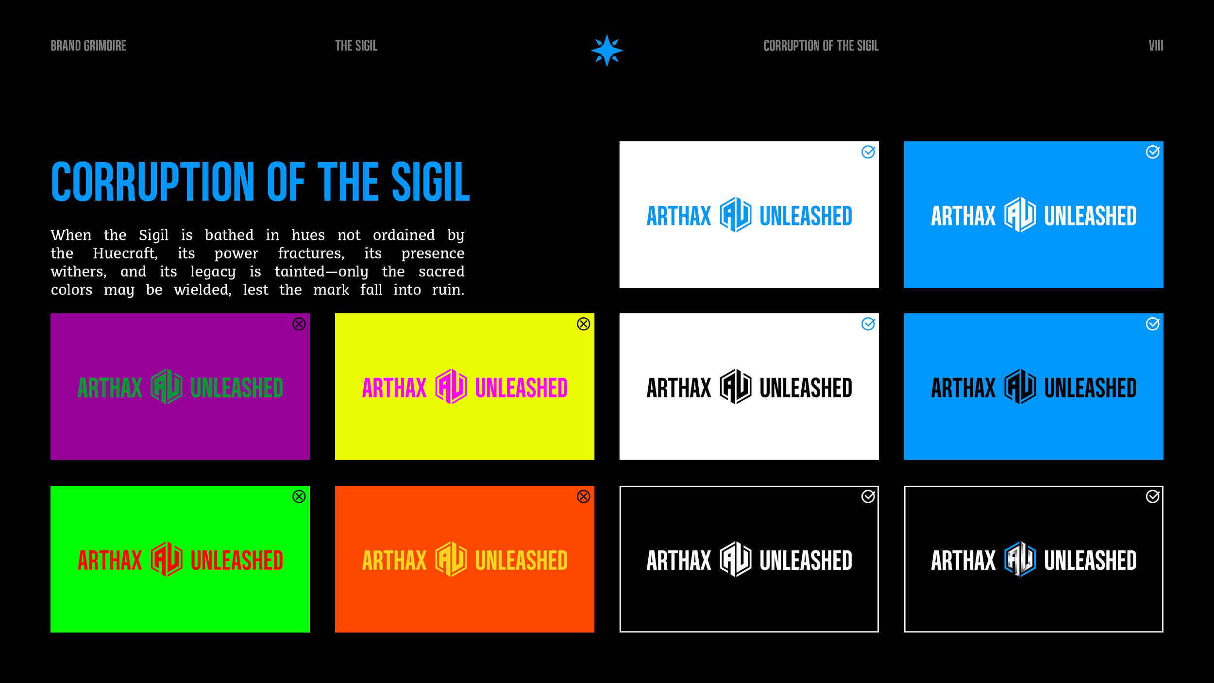Arthax Unleashed is a bold visual identity project built around themes of power, legacy, and progression. The design blends striking visuals with a structured system of symbols, colors, and type to create a cohesive brand. Each element, from the Sigil to the Huecraft, was crafted to reinforce a sense of dominance and growth, rewarding long-term engagement with evolving visuals and design elements.