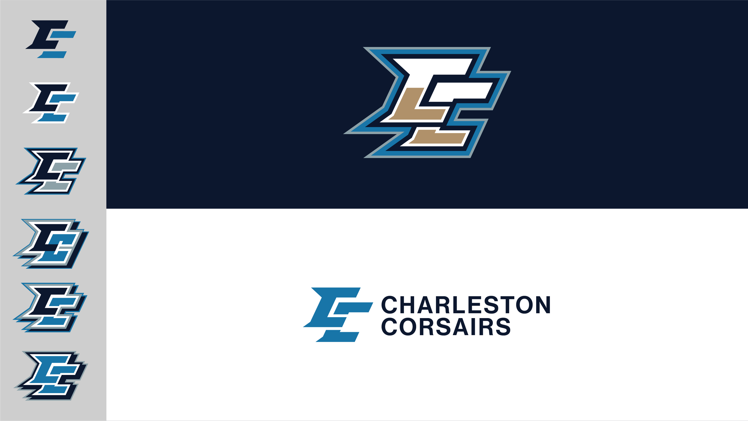 This stage shows how the team mark came to life once the full palette was defined. I ran through several color combinations using the brand colors to see how each version carried the energy of the mark. That exploration led to introducing a new tone that helped everything click. The image walks through the iterations on the left, ending with two final versions on the right that show the mark on its own and paired with the supporting Charleston Corsairs type.