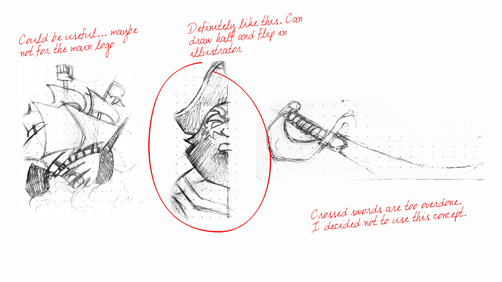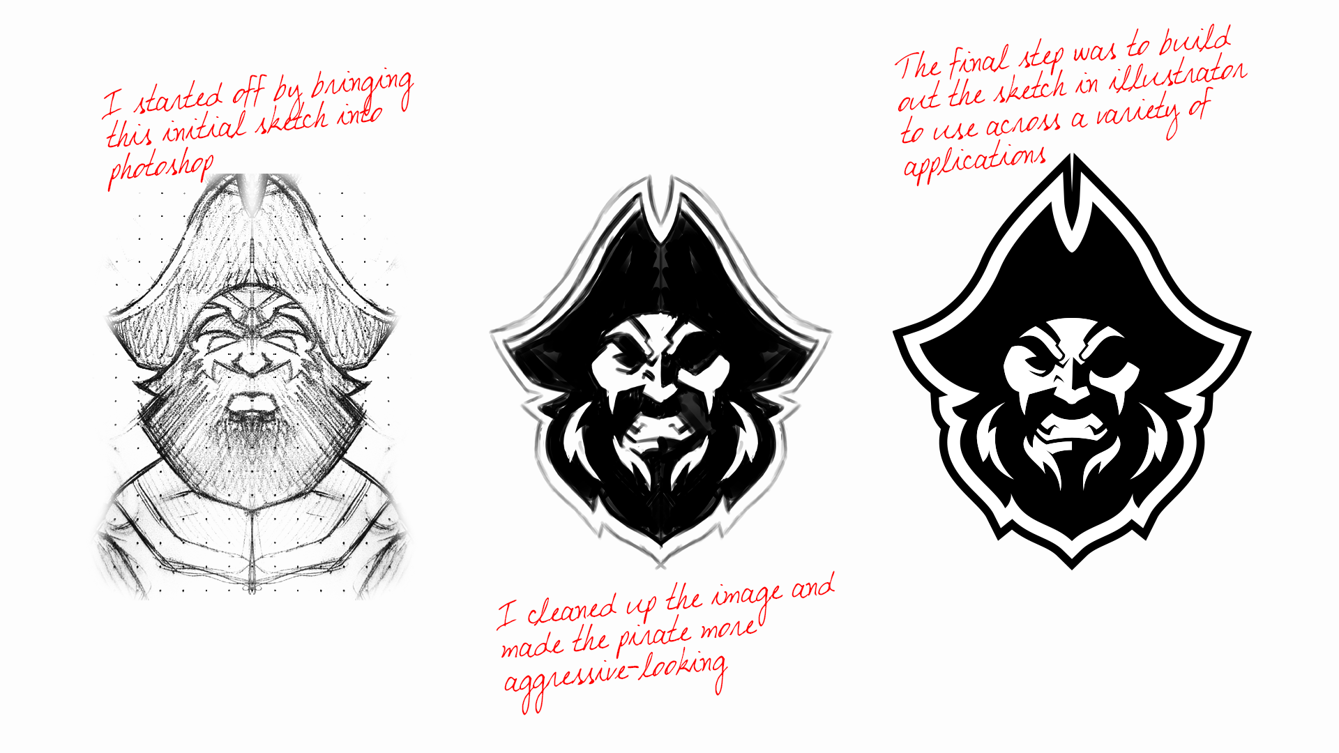 These are the first sketches that kicked the project off. I wanted to tap into South Carolina’s deep pirate history since it gives the team a bold identity that feels rooted in the state. The goal was to explore shapes, symbols, and attitudes that could carry that energy. Even in the rough stage, the idea of a pirate influenced team felt exciting and easy to rally behind.