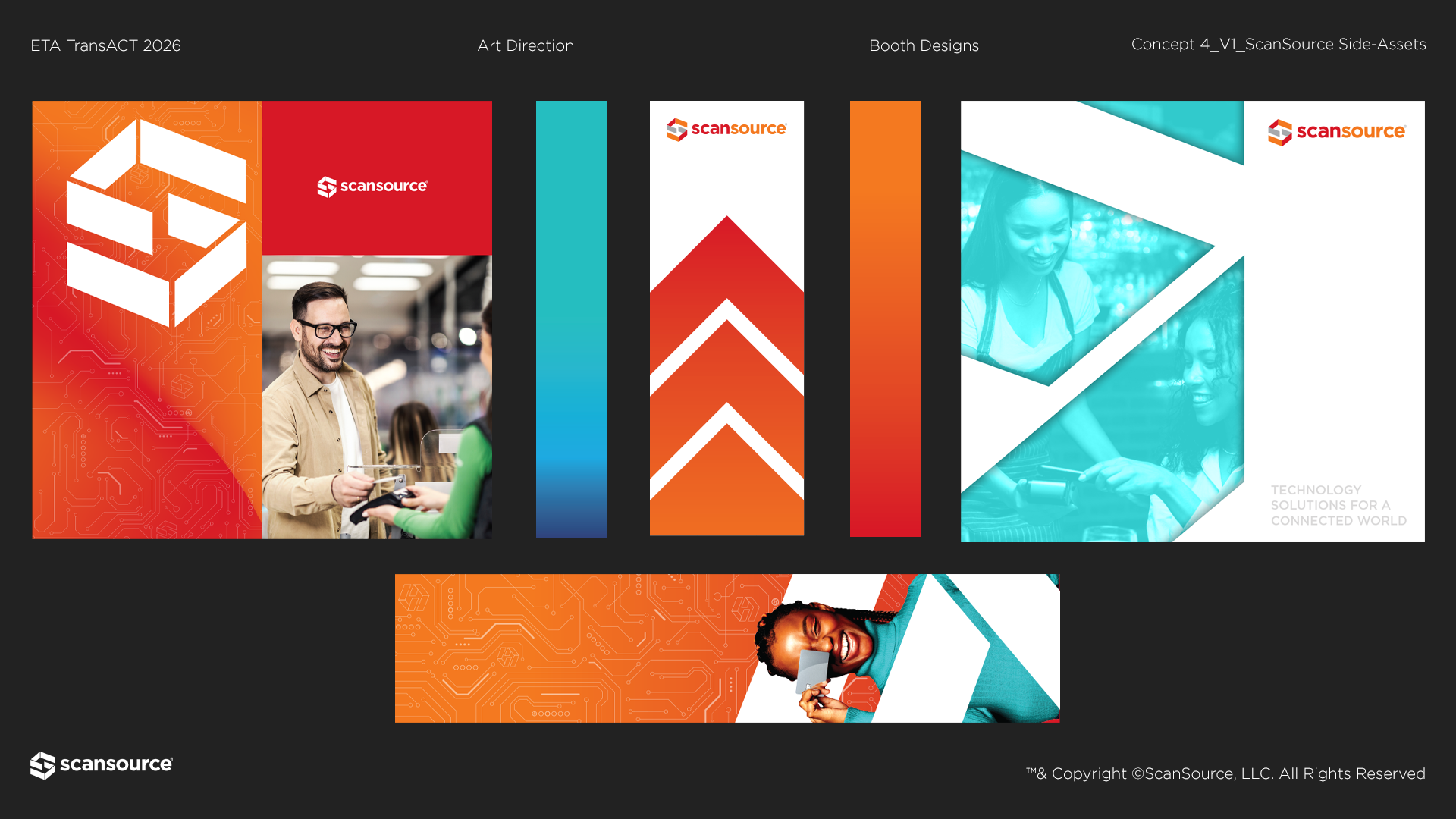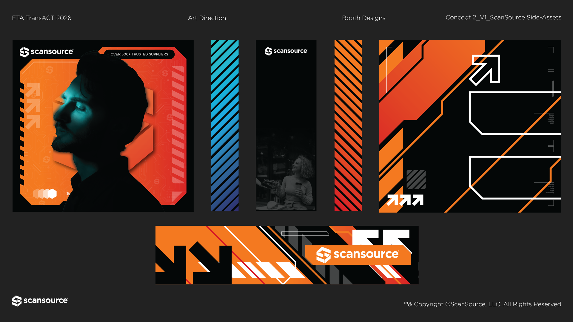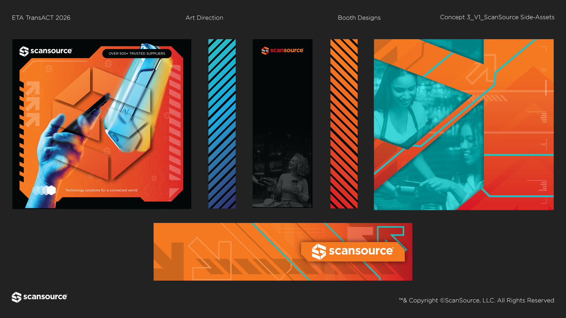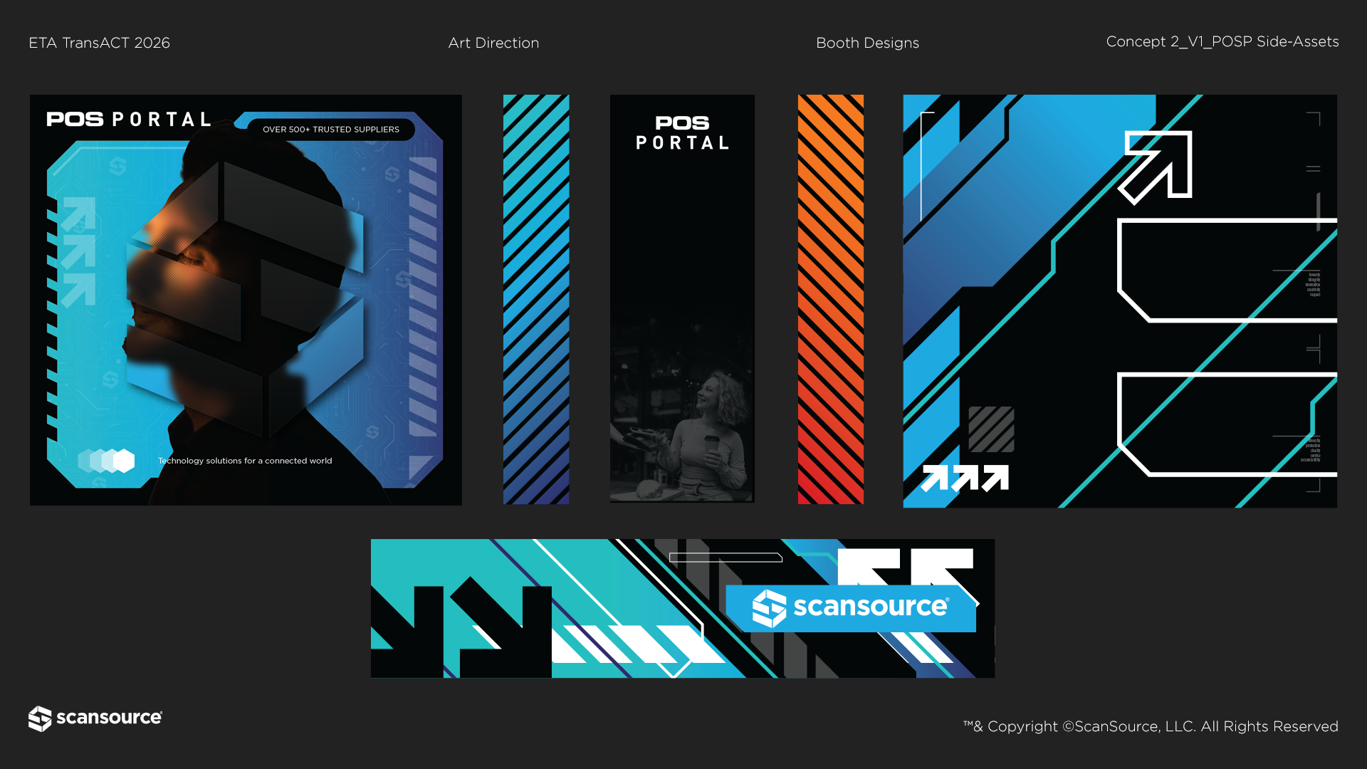 This direction merges system and experience into one language. The high-tech foundation is softened with glass-like layers and transparency, adding depth and a more premium, refined feel. The Creation of Adam reference returns as a subtle cue for connection, integrated into the broader flow rather than standing alone. ScanSource elements are woven throughout, bringing both brands closer together. Not fully blended, but clearly converging.