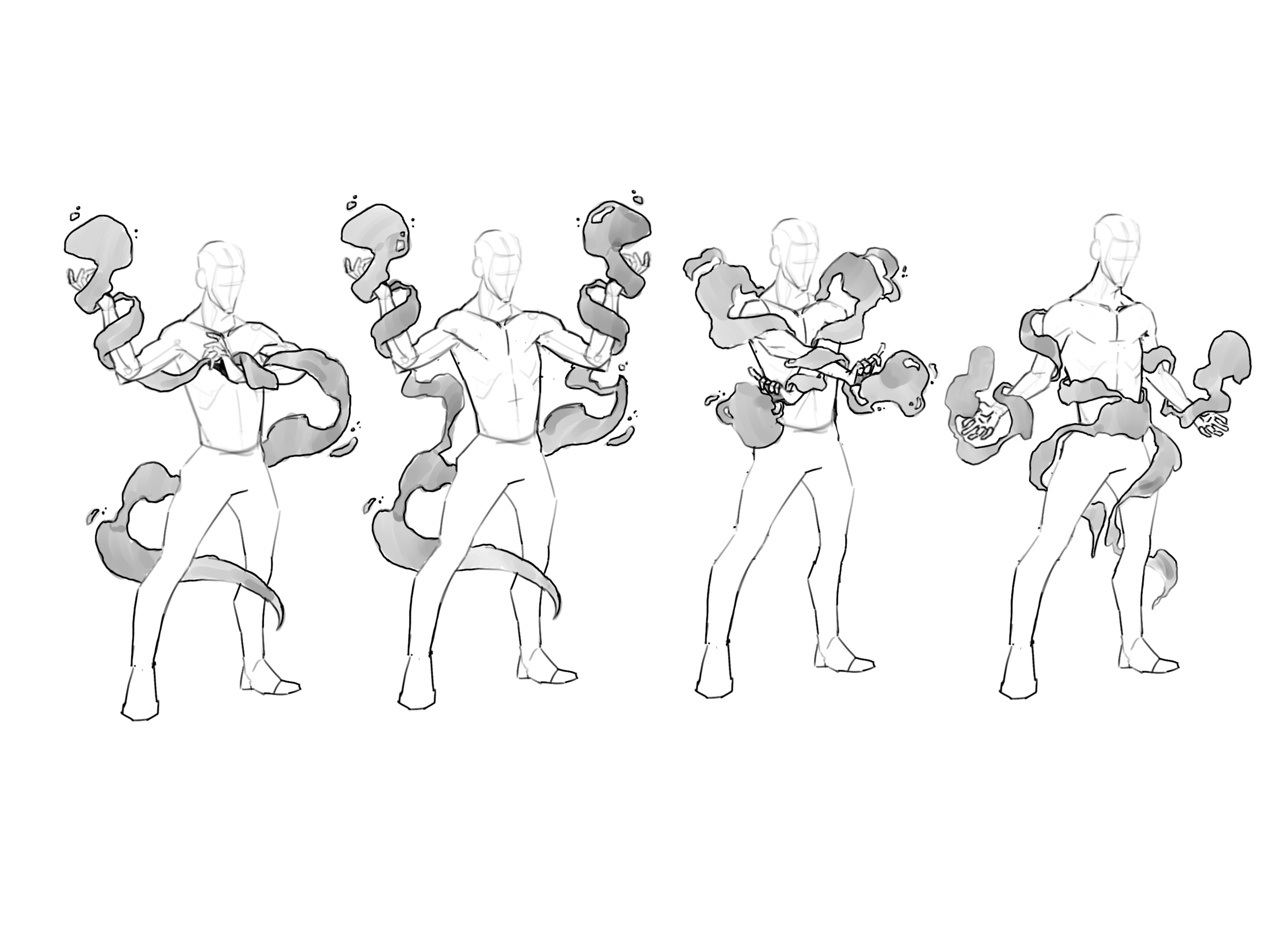 This exploration focuses on how Hyde uses his mind to control nanobots, with poses that emphasize his intellectual command. The goal was to show the nanobots enveloping him, aligning with his in-game suit where they form his outer layer. Each pose highlights his connection with the nanobots, reflecting both his mental control and the tech's integration into his design.