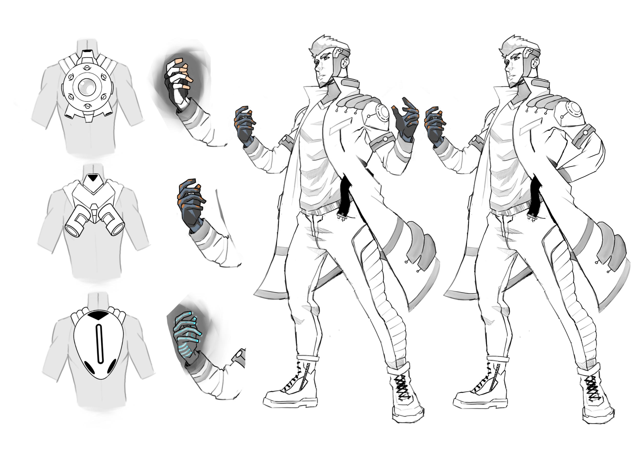 This image dives into the variations of Hyde’s gloves, each designed to enhance his control over the nanobots. We also explored different designs for the container on his back, showing how it operates to deploy the nanobots whenever needed. These elements are key to his functionality, ensuring he’s always ready with the tech he needs.