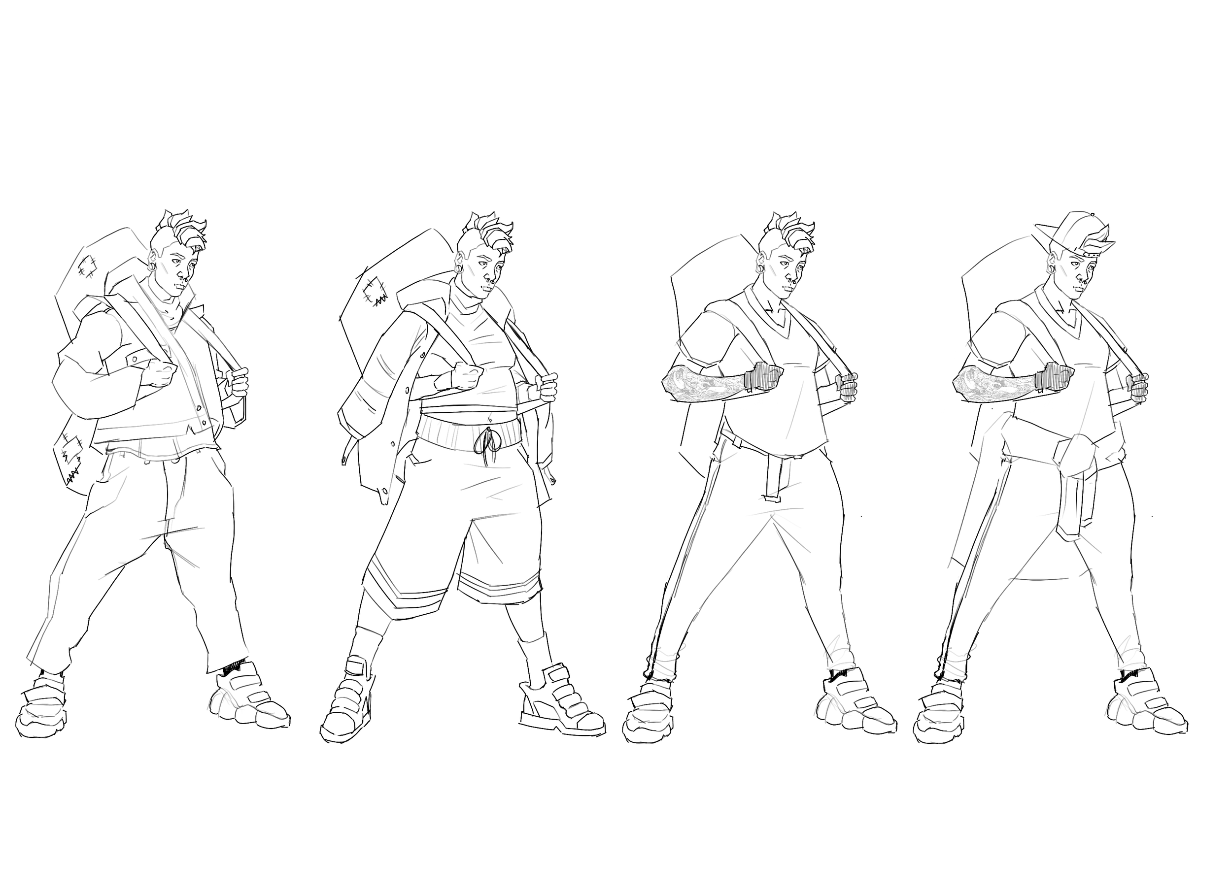 These outfit explorations reveal how Kinetic's wardrobe is a patchwork of whatever they’ve managed to find. The goal was to show that they make do with just the clothes on their back and what’s stashed in their carry-on bag, always strapped securely. Each look reflects their resourcefulness, as they piece together their outfit from street finds, blending practicality with the remnants of their resilience.