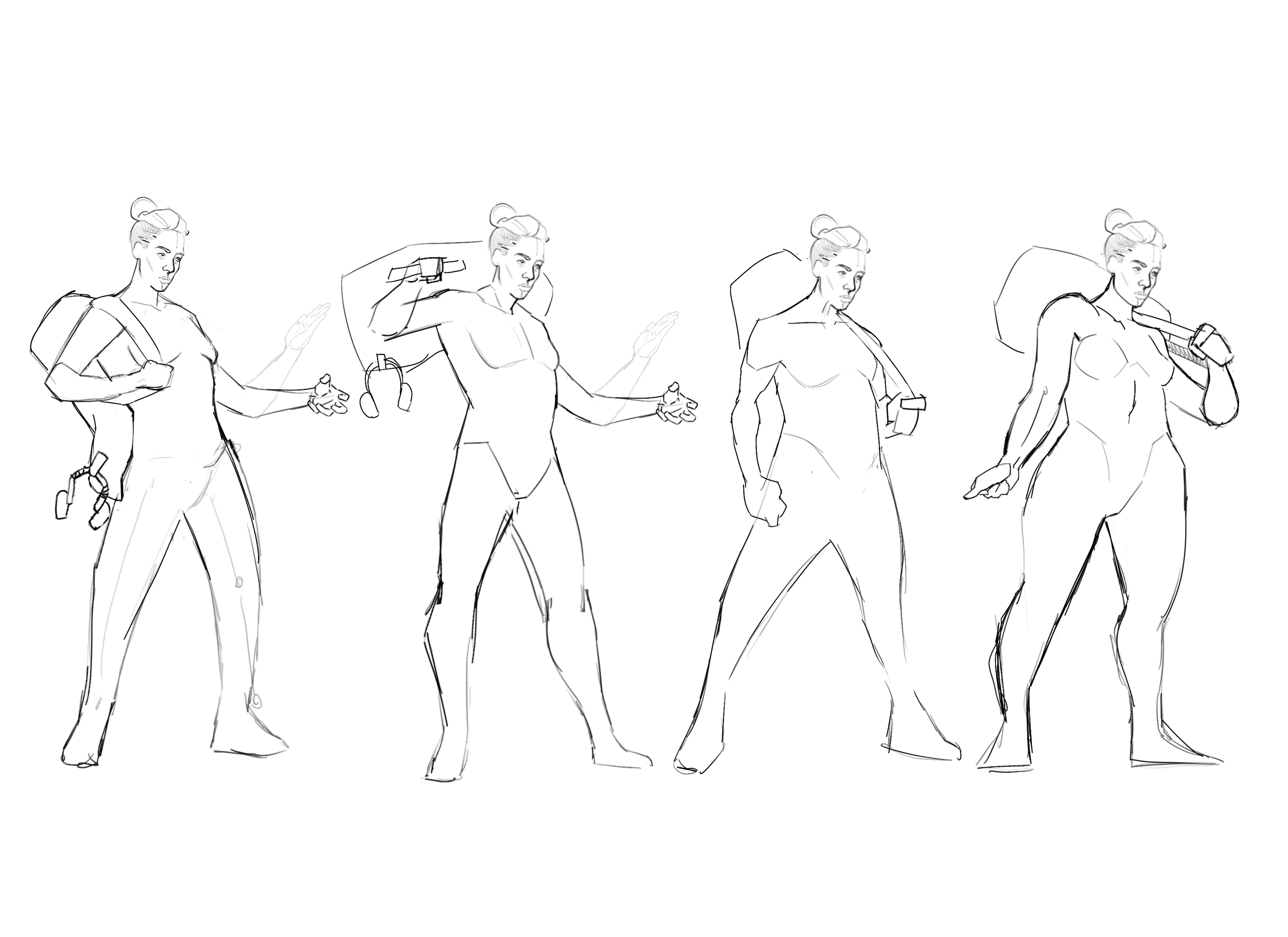 In these poses, we explored how Kinetic uses their powers while managing the challenge of keeping all their belongings with them. We aimed to capture the balance between their dynamic abilities and the practical reality of carrying everything they own. The process involved fine-tuning poses to show how their possessions interact with their movements, highlighting the constant struggle to maintain control and stability.