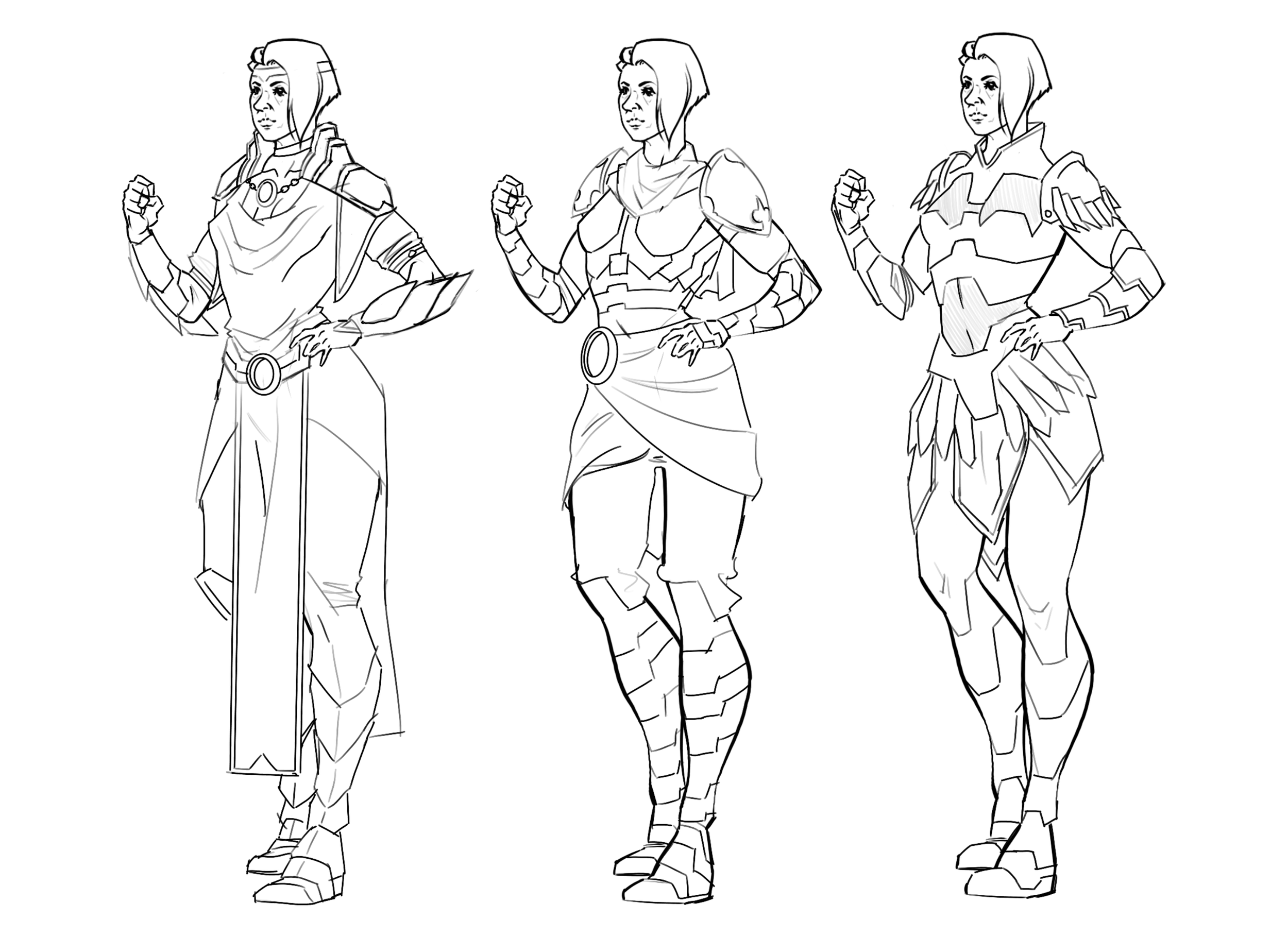 This page captures the full design process for Seraph, from rough concepts to final render. We explored a mix of power and style, balancing her tactical edge with that classic hero look. The poses emphasize her strength, while the armor and jacket show both practicality and flair. Facial expressions and alternate poses bring out her resolve and fierce determination, reflecting the depth of a seasoned fighter who still stands firm.